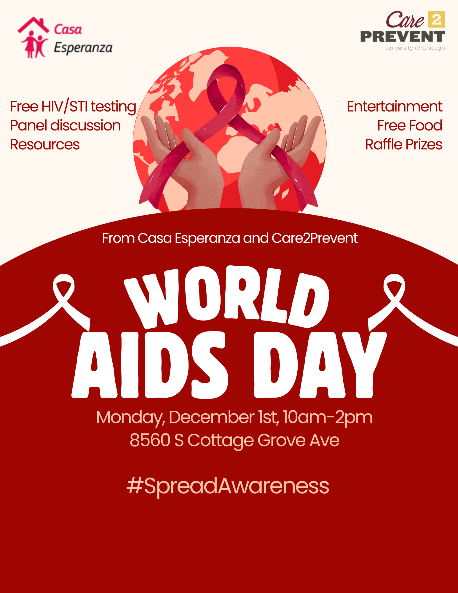 Care2Prevent is pleased to announce a new World AIDS Day event in collaboration with Casa Esperanza. This year’s event will include health screenings for HIV and STIs, blood pressure and blood sugar as well asinformation about access to housing, food and employment.
